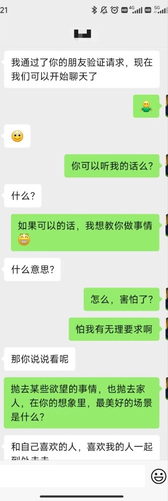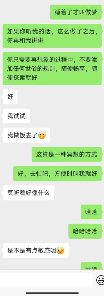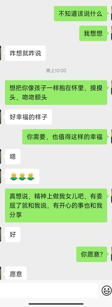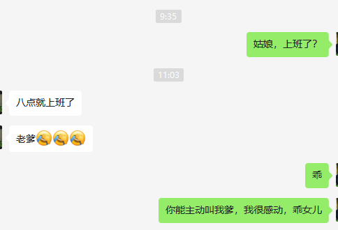 晚上一直没有主动联系我,我看他探探在线,就在微信上问了一下没想到有了点突破,只是不够完美,那一声“爸爸”她没有叫出口